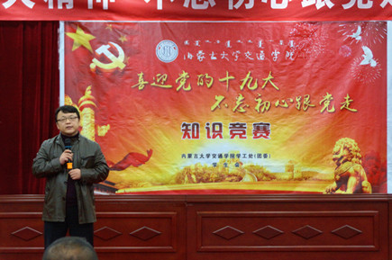 11月15日晚7時(shí),由學(xué)工處(團(tuán)委)和黨群工作部共同舉辦的內(nèi)蒙古大學(xué)交通學(xué)院“喜迎黨的十九大,不忘初心跟黨走”主題知識(shí)競(jìng)賽在交通樓A453拉開(kāi)帷幕。黨群工作部郭鵬飛、學(xué)工處(團(tuán)委)孫立宇出席活動(dòng)。近300名學(xué)生現(xiàn)場(chǎng)觀摩了競(jìng)賽。